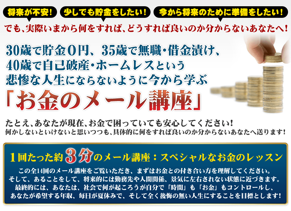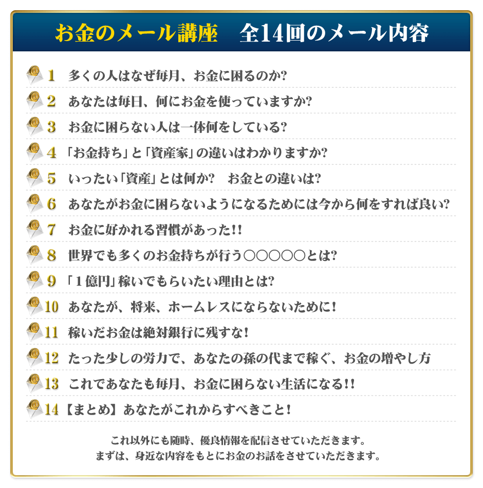 そこで、多くの方がお金に困らないよう、この全14回のメール講座で、