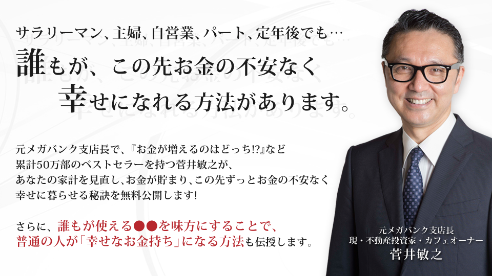 退職後、自身が見てきた「幸せなお金持ち」が実践していたメソッドを使い、銀行をパートナーにして、不動産賃貸業をはじめ、現在では、「金の卵を産むニワトリ」を6棟持つオーナーとして、年間7,000万円の不動産収入がある「幸せなお金持ち」に。 著書に『お金が貯まるのは、どっち!?』(アスコム)他多数。著書累計50万部を突破し、2015年オリコンランキングビジネス書部門第1位を獲得。 |