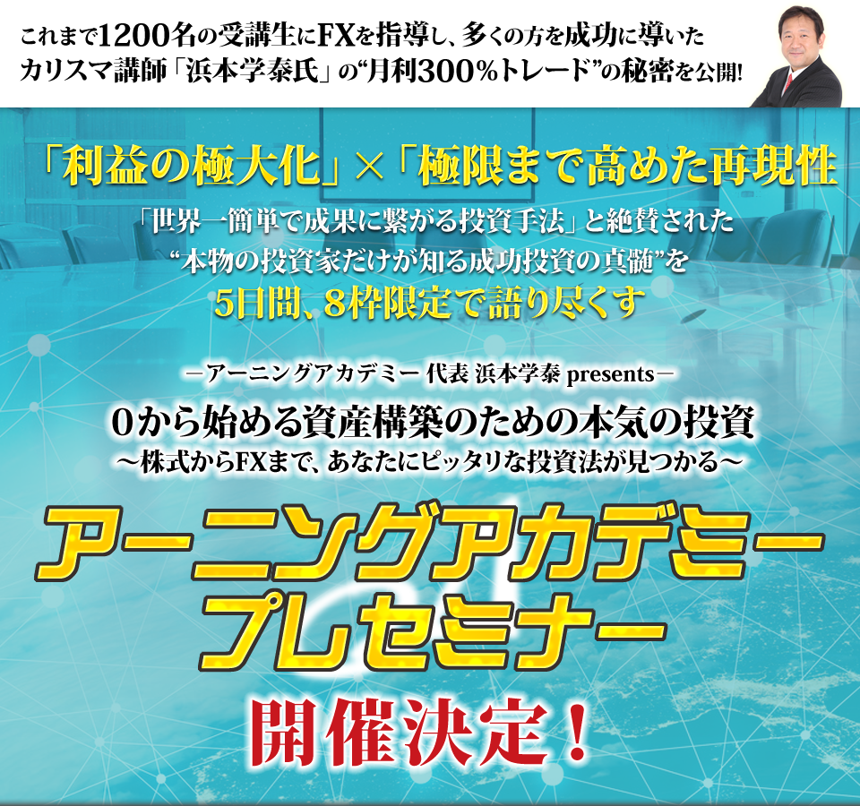 退職後は個人投資家となり、株式投資をする傍らで、長年取り組みたかったFXトレードを始める。いきなり月利300%を継続的に勝ち続け、これまで学んできた投資理論が正しい事を証明する。2009年より自らの手法をまとめたFXトレードを教え始め、2015年アーニングアカデミーを設立。Eラーニングとリアルセミナーを合わせて、多くの人たちに投資やトレードの魅力と効用を伝えて、一人でも多くの経済的に独立した人を増やす活動をしている。現在までに教えた受講生の総数は1200名以上。