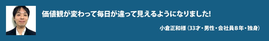 一生独身かとあきらめかけていたときにセミナーに参加させてもらい、この悔しさをお伝えしたところモニターにしてもらうことに成功!年収に近い金額を2か月ほどで稼がせていただいて、婚活パーティーで表示できる金額も一気にあがり、おかげさまで若い子を中心に逆にお声がかかるように!