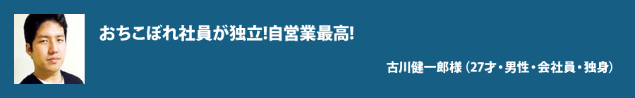 自分が独立したときには誰もが頭のおかしい負け組、上司に至っては負け犬扱いでしたが、好きな車にのって、ライザップで体を鍛えて、今絶賛、青春を取り戻し中です!