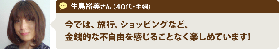 今では、旅行、ショッピングなど、金銭的に不自由を感じることなく楽しむことができています。