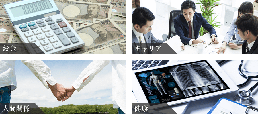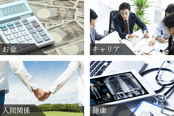 見た目、健康面、仕事・キャリア、ビジネス、家族や夫婦の関係、職場の人間関係、お金、自分自身のあり方など、