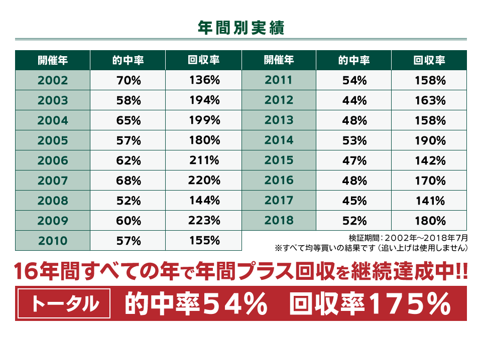 JRA3連複販売開始の2002年から2018年7月まで16年もの長期期間で