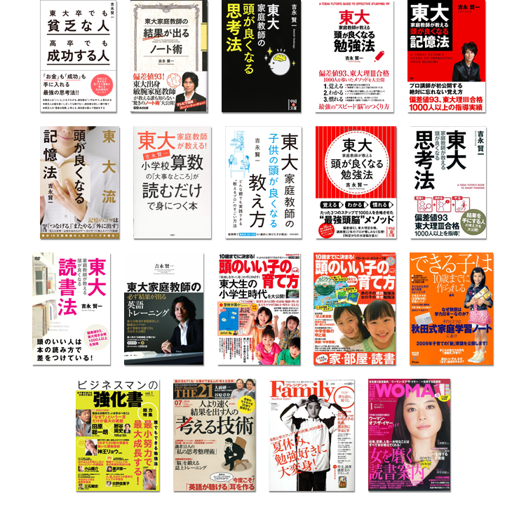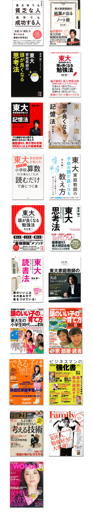 著書『東大家庭教師が教える』シリーズ(KADOKAWA) は累計50万部を超え(電子版含む)、中国語版、韓国語版、台湾語版なども発行されている。