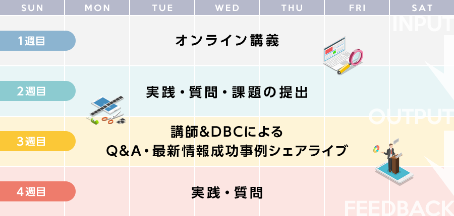 講座では講義を行うだけではなく、課題を出し、実践いただき、アウトプットしていただき、それに対して現役DBCがフィードバックをしていきます。