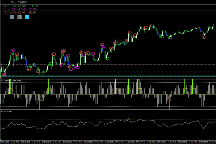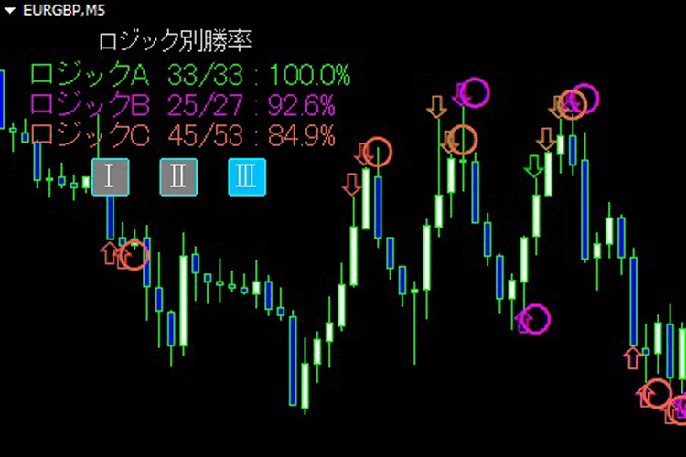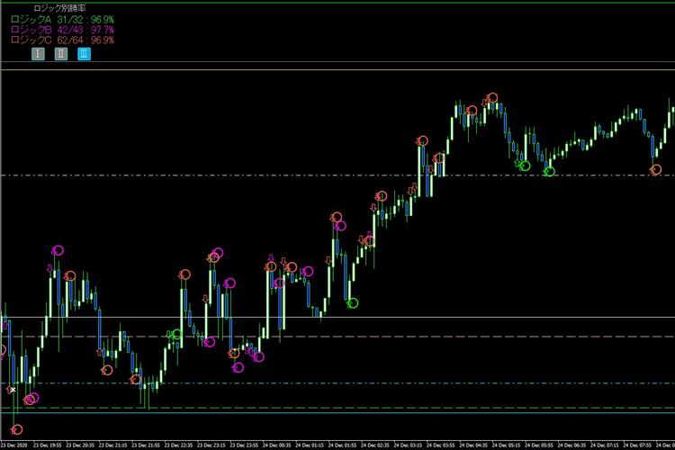通貨ペアに合わせて開発された3種類のロジックをロジックA→緑色/ロジックB→ピンク/ロジックC→オレンジと色別で表示します。